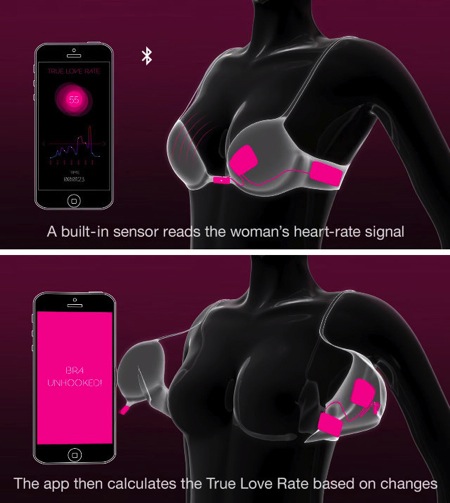 日本高端内衣品牌 Ravijour 推出了一款智能前扣文胸,该文胸只有在穿戴者有“爱的感觉”的时候才会自动解开(穿戴者自己也可手动开扣),以防有人图谋不轨。文胸内置有心率检测器,它可以时刻监测穿戴者的心跳与神经变化,获得的数据被传送到手机上的配套APP上,再经过一系列复杂检测算法后,只有当频率达到特定的“心动频段”时,前扣才会自动打开,让穿戴者好好享受爱的感觉。如此一来,女性朋友在聚会时就不必担心被人恶意侵犯啦。【视频】