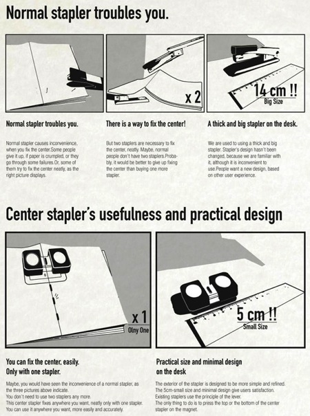 骑马钉对于绝大多数订书钉来说都十分难操作,这款中缝订书器专为此设计,您只需把垫板放在最下面,将订书器对准中缝,然后双指按下即可完成装订,提高办公效率的利器哦!